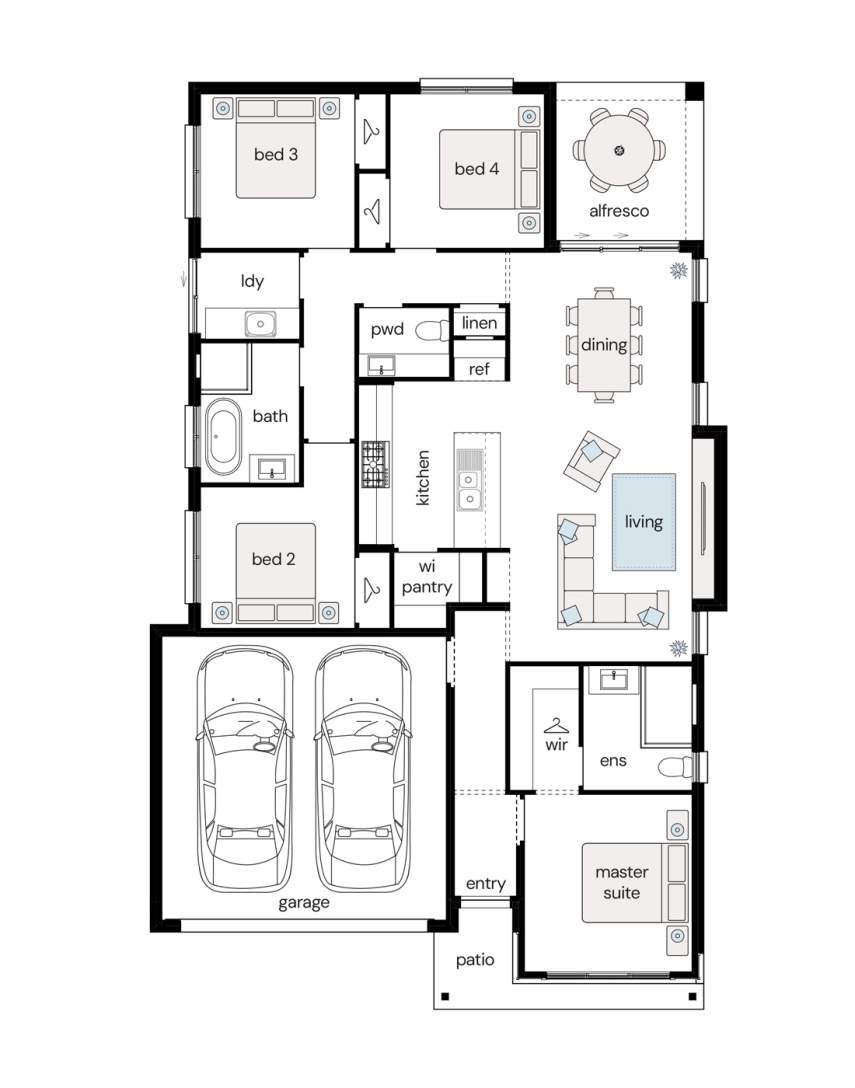 Note: This floor plan is for illustrative purposes only and is subject to change and product substitution. Drawings, renders and materials shown are purely an expression of the artist and may depict details, aesthetics, fixtures, finishes, and features not supplied or offered, or no longer available by Complete, including but not limited to alfresco decking, window and household furnishings and landscaping.