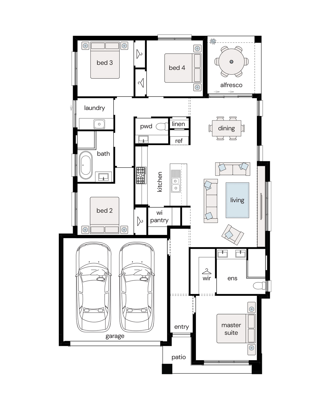 Note: This floor plan is for illustrative purposes only and is subject to change and product substitution. Drawings, renders and materials shown are purely an expression of the artist and may depict details, aesthetics, fixtures, finishes, and features not supplied or offered, or no longer available by Complete, including but not limited to alfresco decking, window and household furnishings and landscaping.