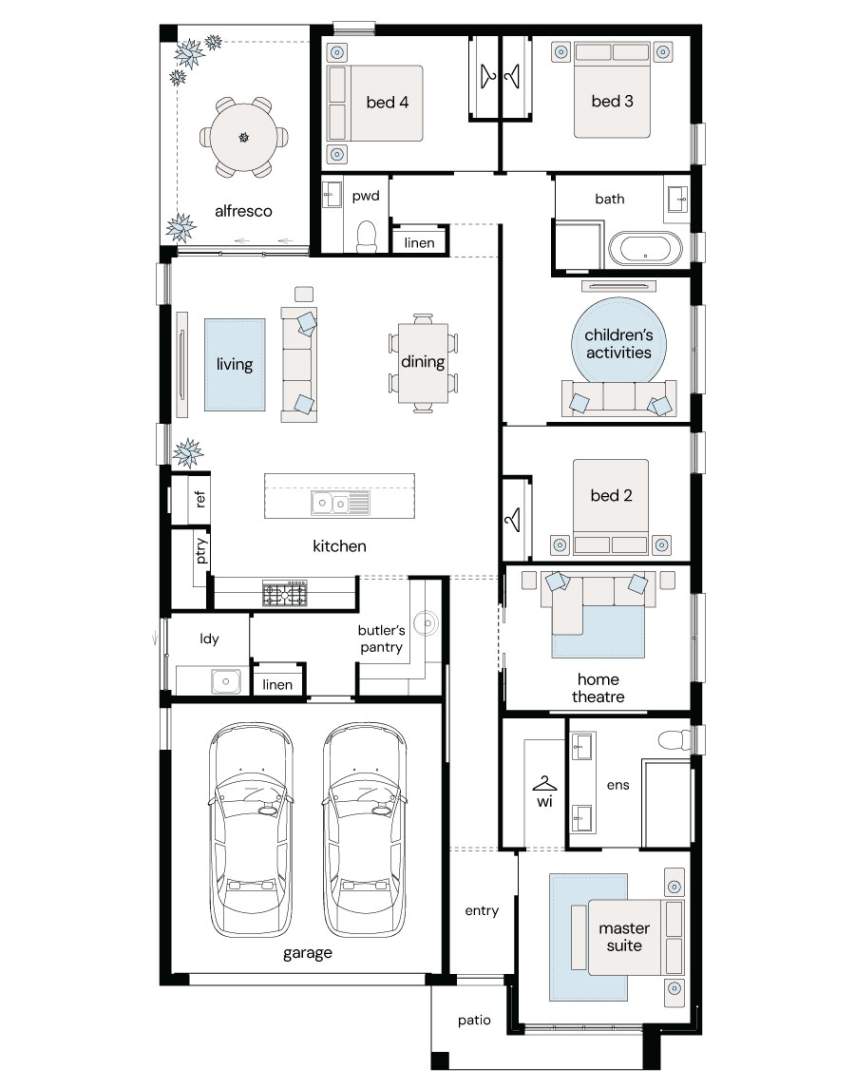 Note: This floor plan is for illustrative purposes only and is subject to change and product substitution. Drawings, renders and materials shown are purely an expression of the artist and may depict details, aesthetics, fixtures, finishes, and features not supplied or offered, or no longer available by Complete, including but not limited to alfresco decking, window and household furnishings and landscaping.