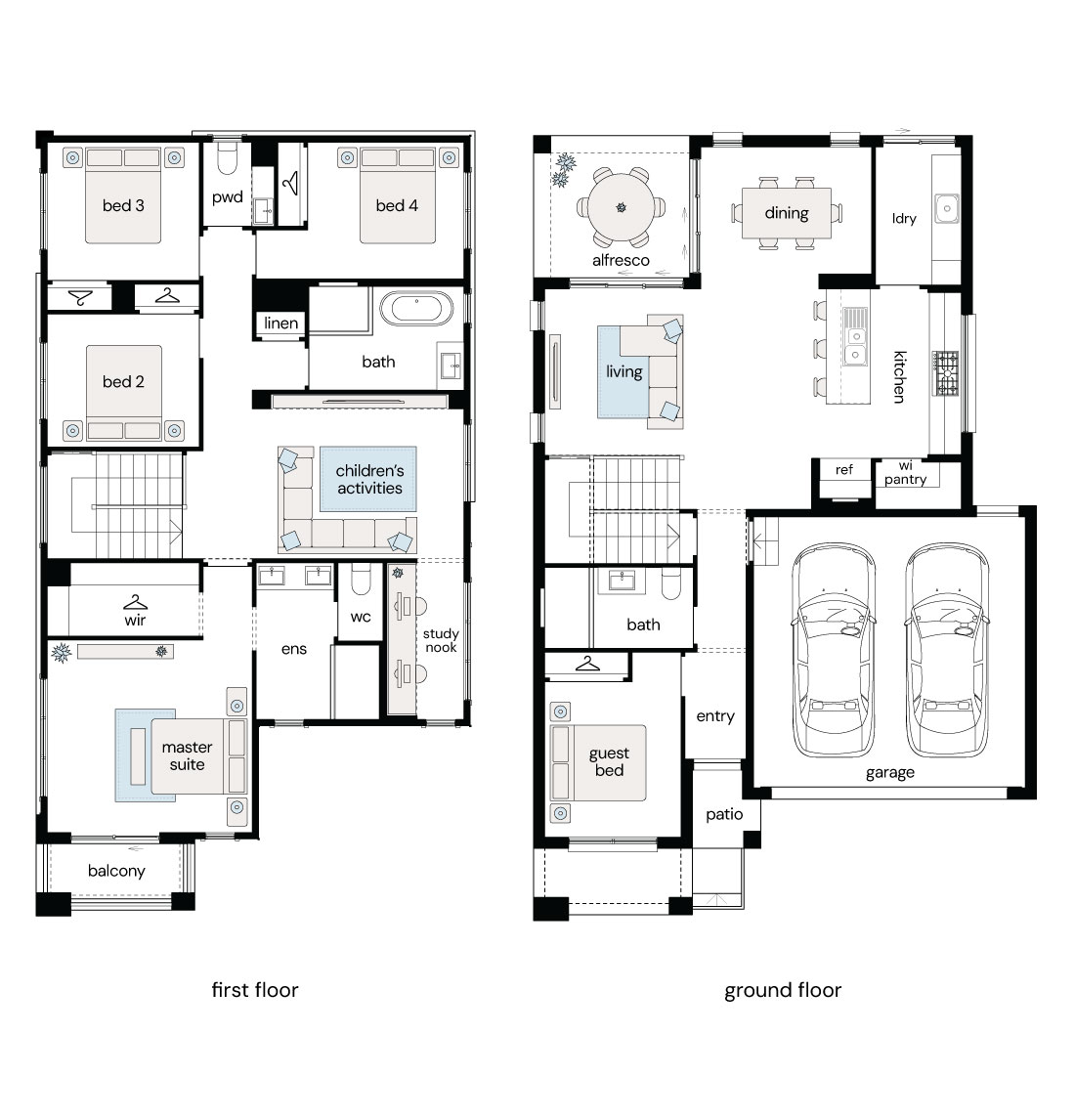 Note: This floor plan is for illustrative purposes only and is subject to change and product substitution. Drawings, renders and materials shown are purely an expression of the artist and may depict details, aesthetics, fixtures, finishes, and features not supplied or offered, or no longer available by Complete, including but not limited to alfresco decking, window and household furnishings and landscaping.