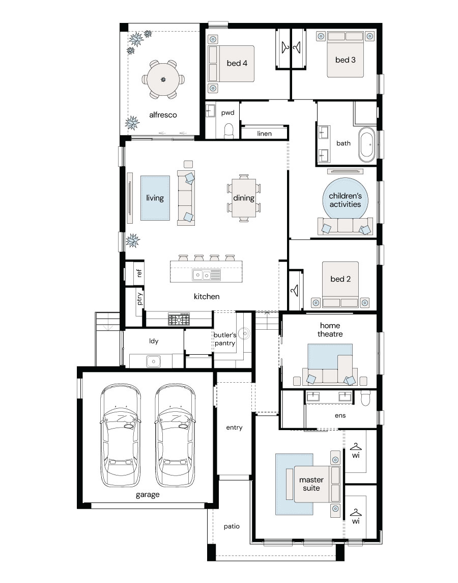 Note: This floor plan is for illustrative purposes only and is subject to change and product substitution. Drawings, renders and materials shown are purely an expression of the artist and may depict details, aesthetics, fixtures, finishes, and features not supplied or offered, or no longer available by Complete, including but not limited to alfresco decking, window and household furnishings and landscaping.