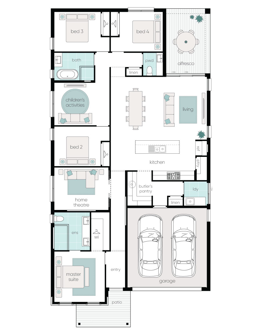 Note: This floor plan is for illustrative purposes only and is subject to change and product substitution. Drawings, renders and materials shown are purely an expression of the artist and may depict details, aesthetics, fixtures, finishes, and features not supplied or offered, or no longer available by Complete, including but not limited to alfresco decking, window and household furnishings and landscaping.