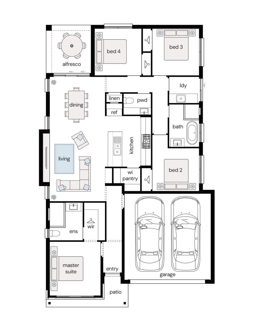 Note: This floor plan is for illustrative purposes only and is subject to change and product substitution. Drawings, renders and materials shown are purely an expression of the artist and may depict details, aesthetics, fixtures, finishes, and features not supplied or offered, or no longer available by Complete, including but not limited to alfresco decking, window and household furnishings and landscaping.